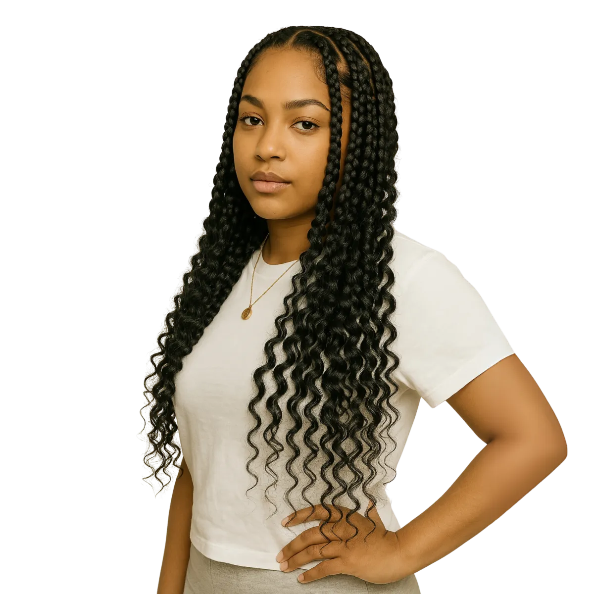 Usually I leave braid appointments sore — not this time. Light tension, great parting, and the curls are perfect. She even had music on and a chill setup. 10/10 experience.